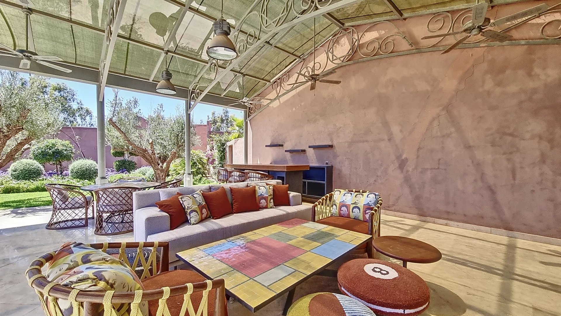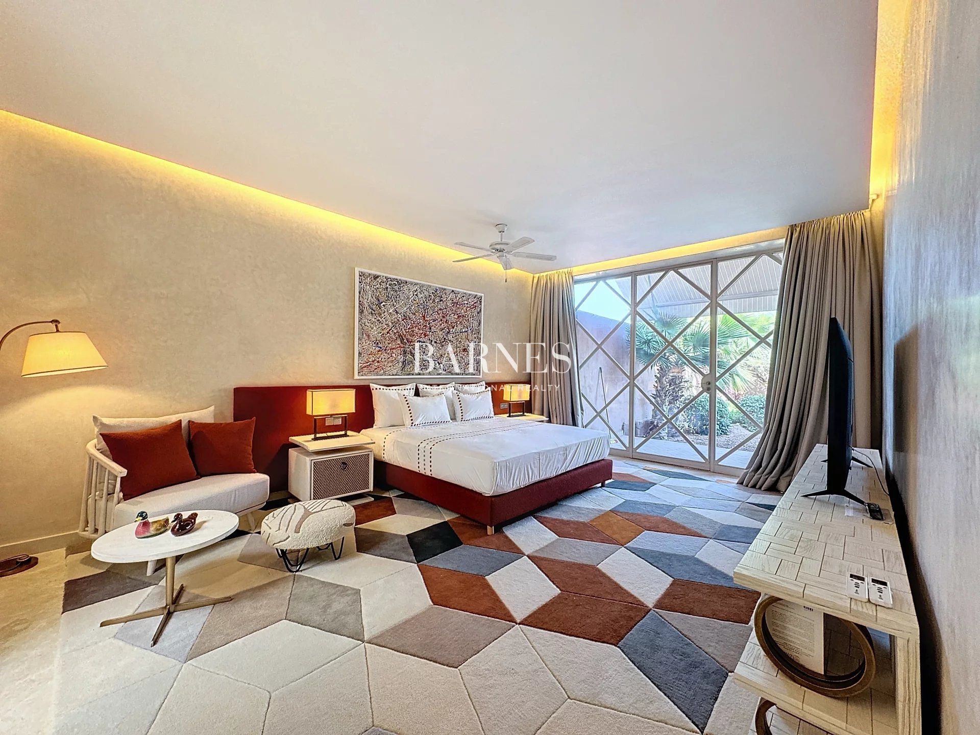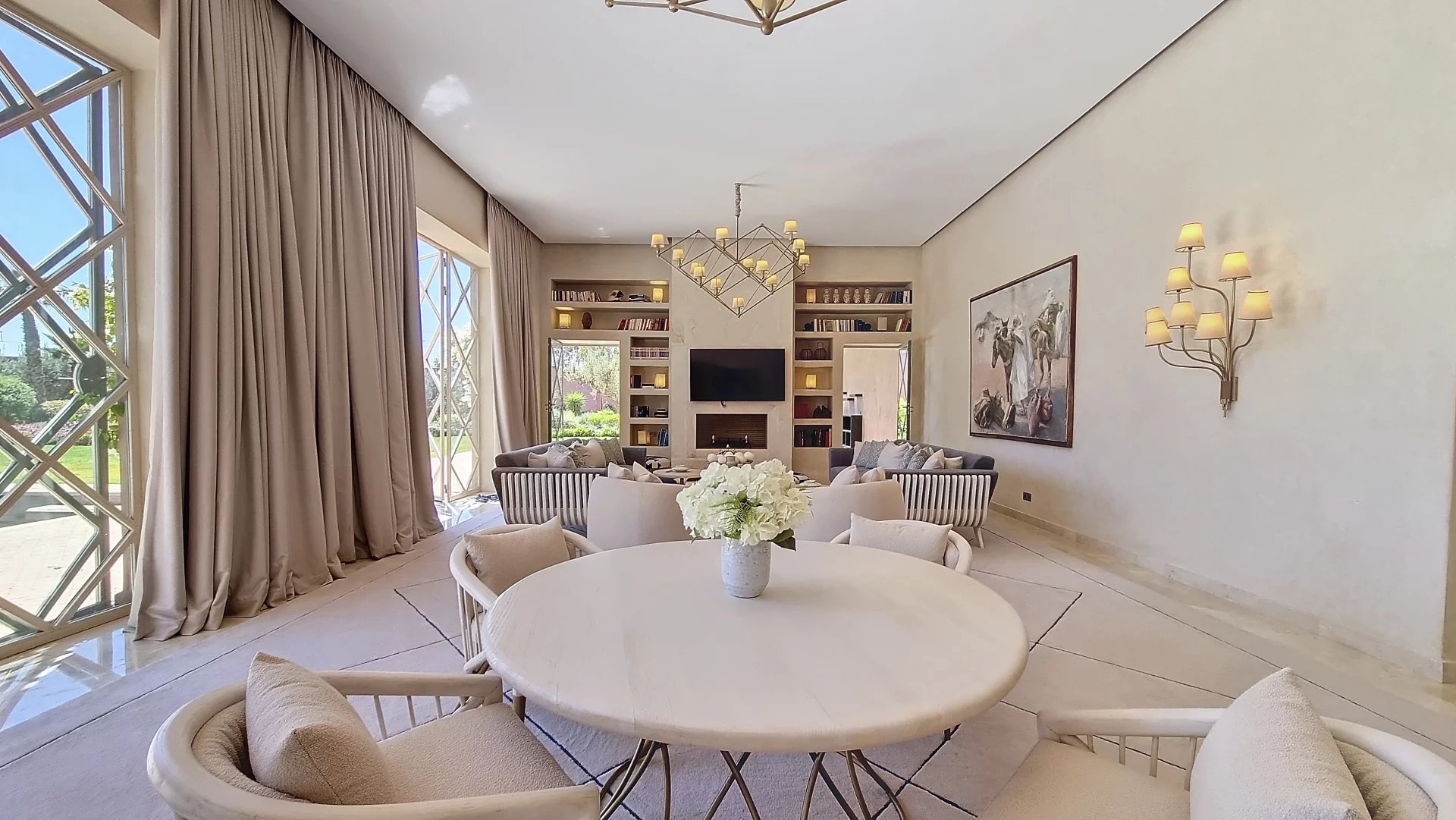 Located in one of the most prestigious estates in Marrakech, this tastefully designed property features multiple reception rooms, a dining room, 5 suites with en-suite bathrooms and dressing rooms, a game room, a cinema, and a spa—all spread across two levels accessible by elevator. With a living area of 1,100 m², this exceptional residence boasts generous volumes that are sure to leave a lasting impression