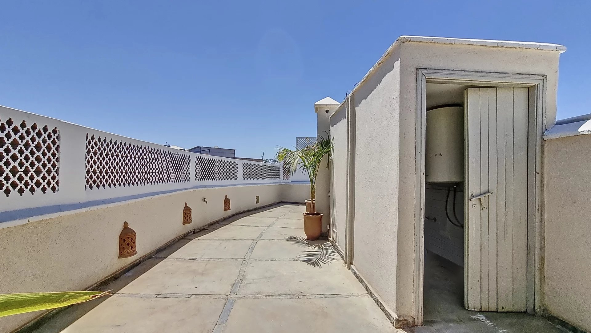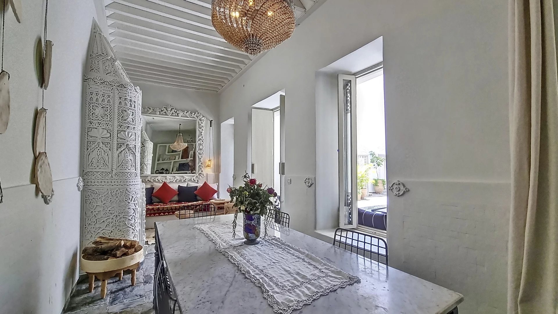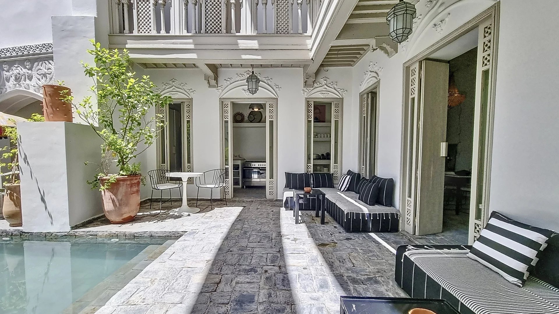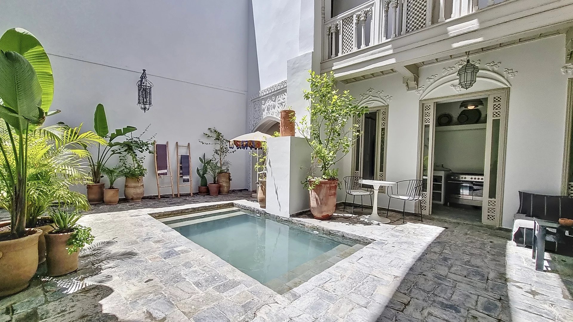 Stunning and Rare Riad with 4 Beautiful Bedrooms for Sale in the Heart of Mouassine, Marrakech Located in one of the most sought-after neighborhoods in the Medina of Marrakech, just a stone’s throw from the famous Jemaa El Fna Square, this exceptional riad offers a unique charm and an unparalleled location. Key Features: Floor Area: 150 m² Unique Patio: A beautiful sunny open patio with a swimming pool Ground Floor: An entrance hallway leading to the magnificent, bright patio with a pool Fully equipped kitchen with a pantry and storage area Laundry room Guest toilet Living/dining room with a fireplace One bedroom with an en-suite bathroom First Floor: 3 stunning bedrooms, each with its own bathroom A beautiful terrace with panoramic views, dining space under a pergola, and storage area This riad is a true gem, located in a peaceful area where you can hear the birds sing, yet just minutes away on foot from the iconic Jardins Secrets. You’ll be captivated by the carefully curated décor, impressive ceiling heights, natural light, spaciousness, and the ideal location. Blending contemporary architecture with Moroccan flair, this property is sure to win your heart during a visit!