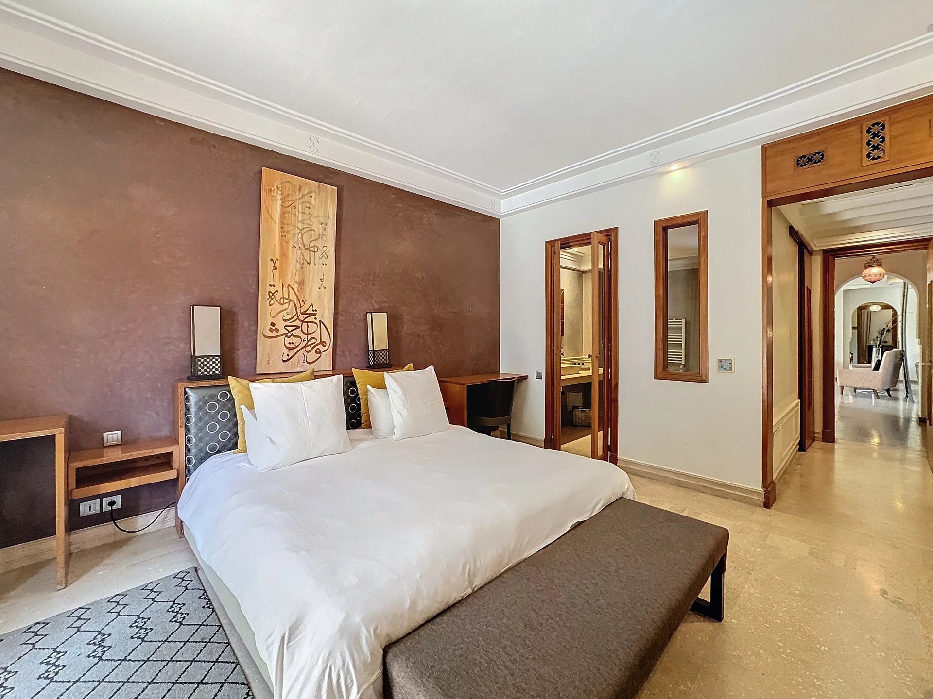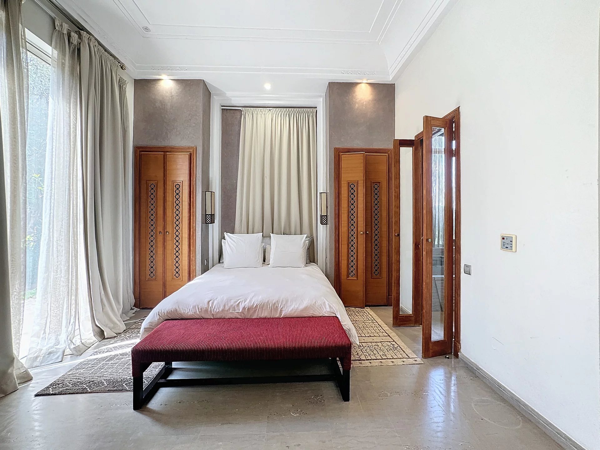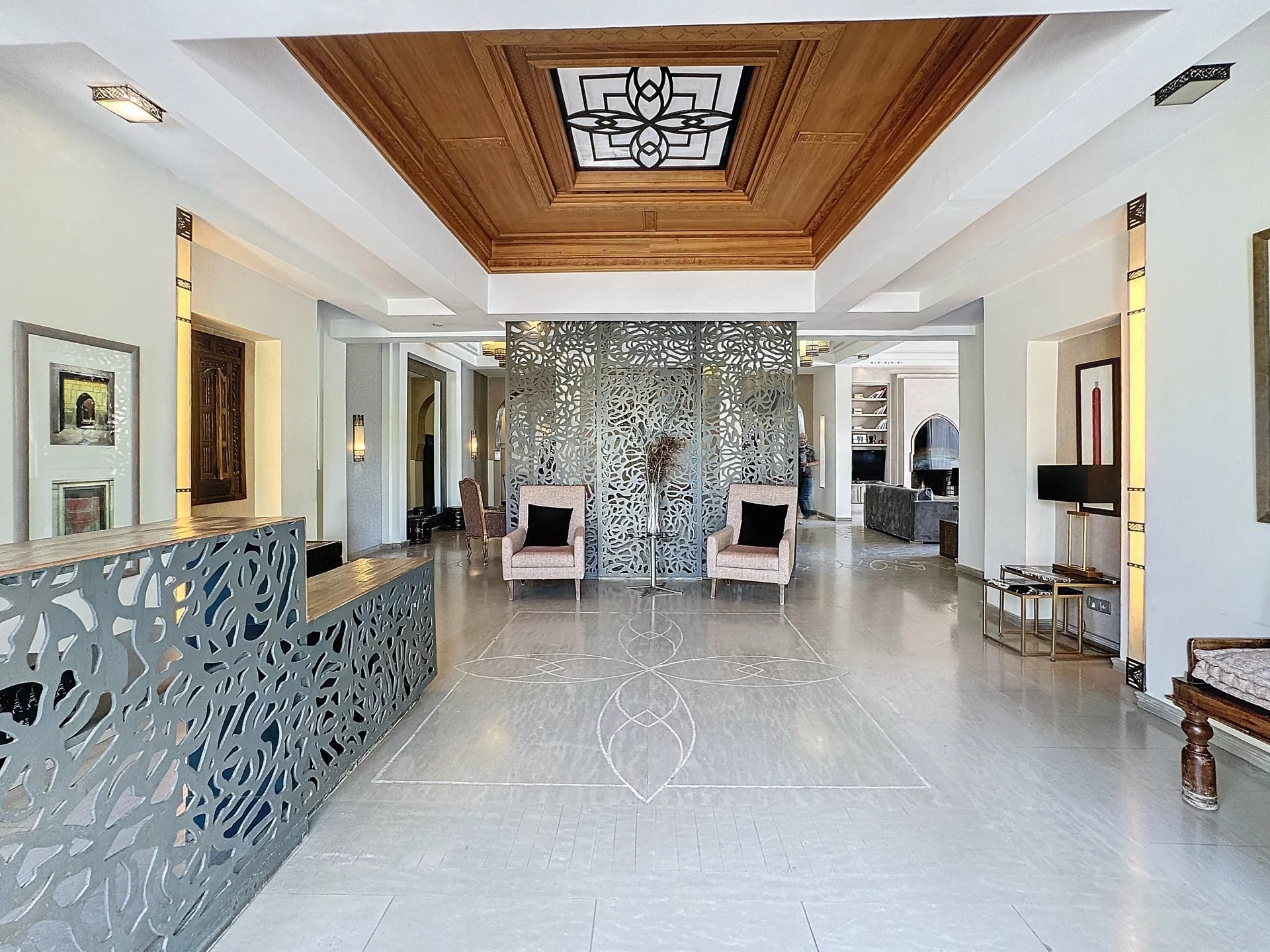 Nestled in the heart of the famous Palmeraie of Marrakech, this exceptional villa spans a 1-hectare plot, offering a luxurious and peaceful living environment. Villa Details: Land Area: 1 hectare of landscaped gardens, providing privacy and tranquility. Bedrooms: 11 spacious bedrooms, each designed for comfort and privacy, ideal for hosting family and friends. Living Spaces: Living Room: Large, bright living room, perfect for relaxing or entertaining guests, with breathtaking views of the garden. Spa: A dedicated wellness space, featuring a sauna, hammam, and massage rooms, offering unparalleled relaxation. Exteriors: Garden: A beautiful, lush garden adorned with exotic plants and fruit trees, creating an oasis of peace. Swimming Pool: A large pool surrounded by terraces, perfect for refreshing swims and enjoying the Moroccan sun. Carport: A secure parking area for multiple vehicles, ensuring comfort and practicality. Highlights: Prime Location: Close to the best amenities of the Palmeraie, renowned golf courses, and fine restaurants. Elegant Ambiance: Traditional Moroccan architecture blended with modern touches, creating a warm and welcoming environment. This villa is a rare opportunity to acquire a property of exceptional quality in one of the most sought-after areas of Marrakech. For more information or to schedule a visit, please do not hesitate to contact us!