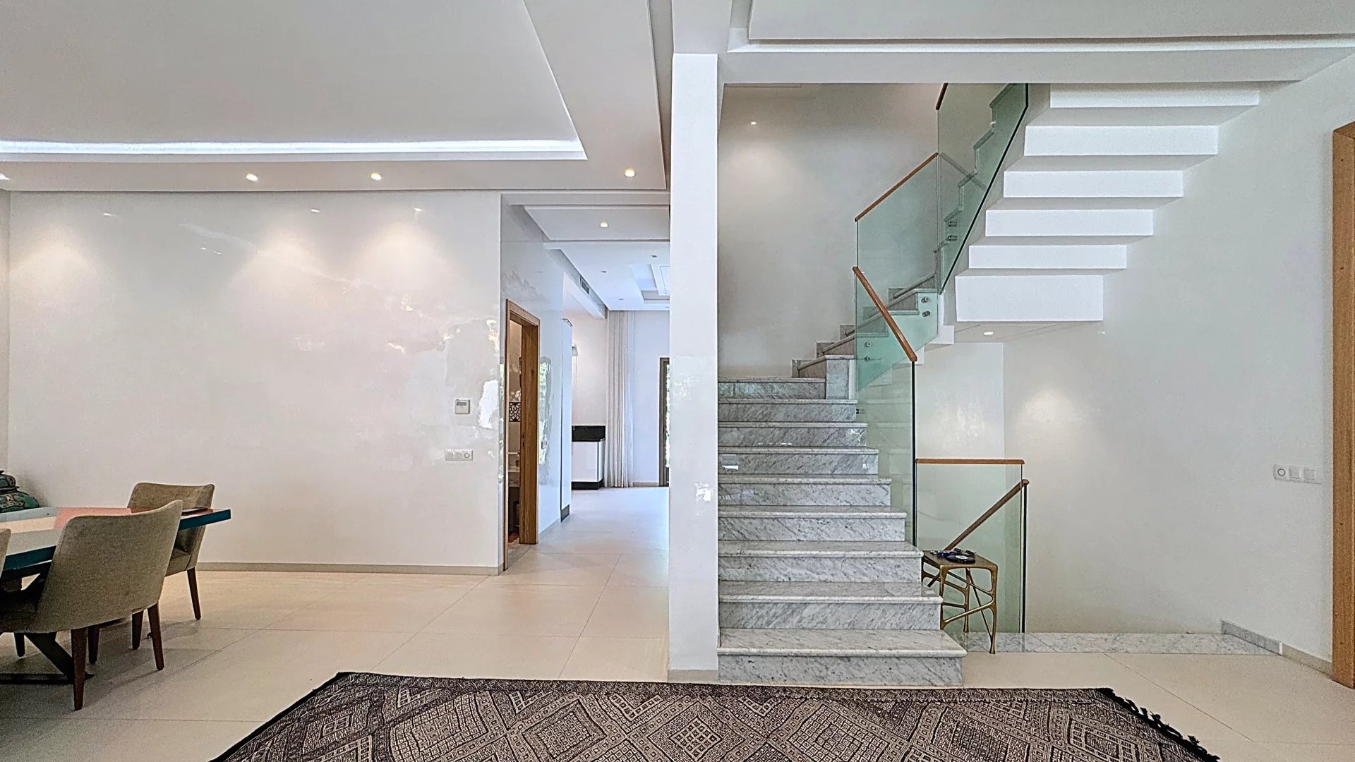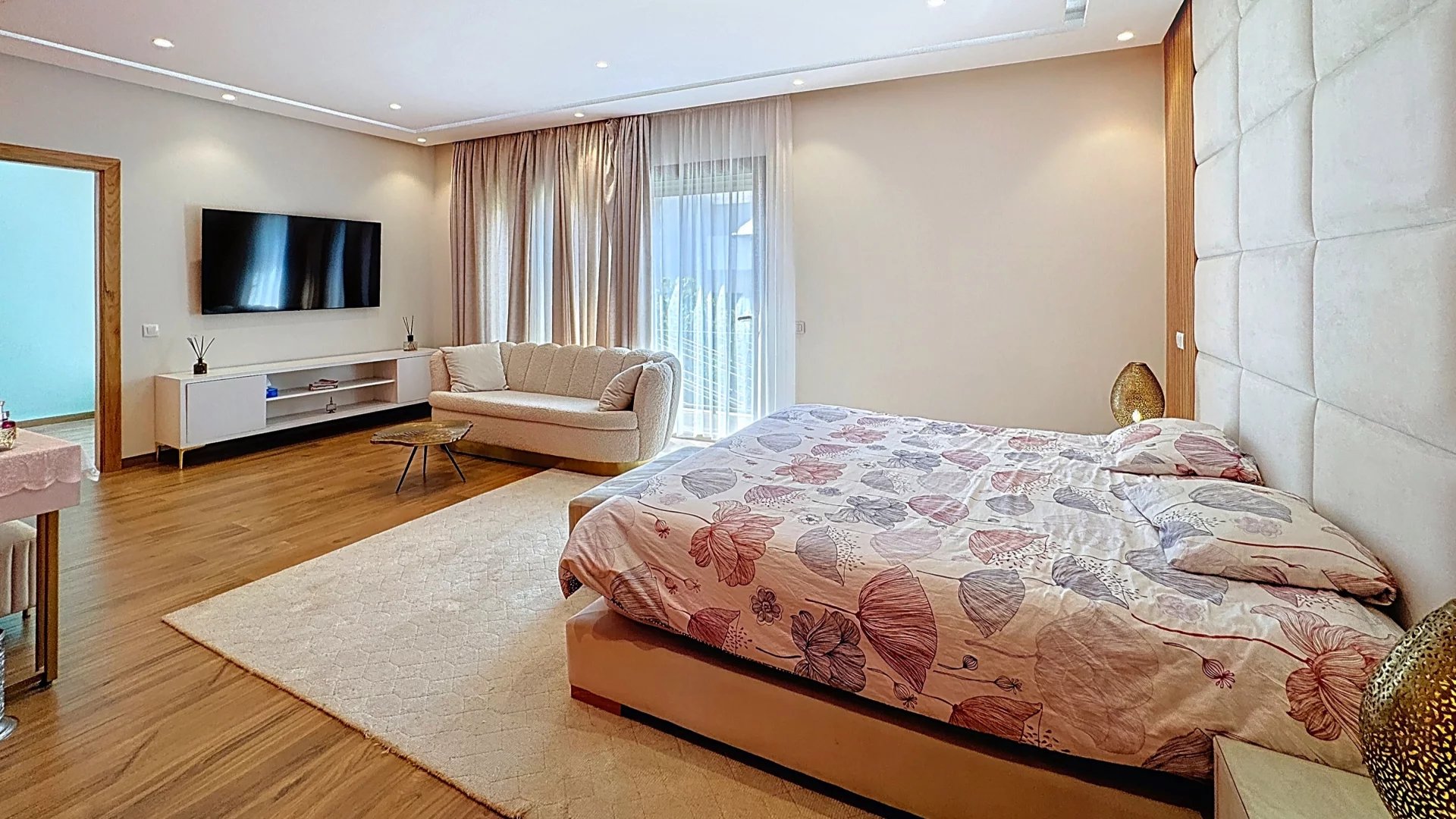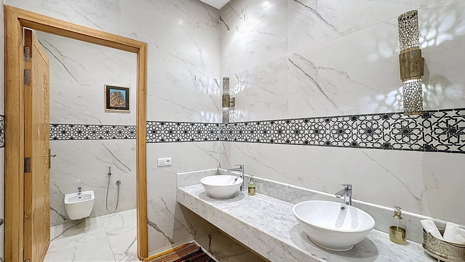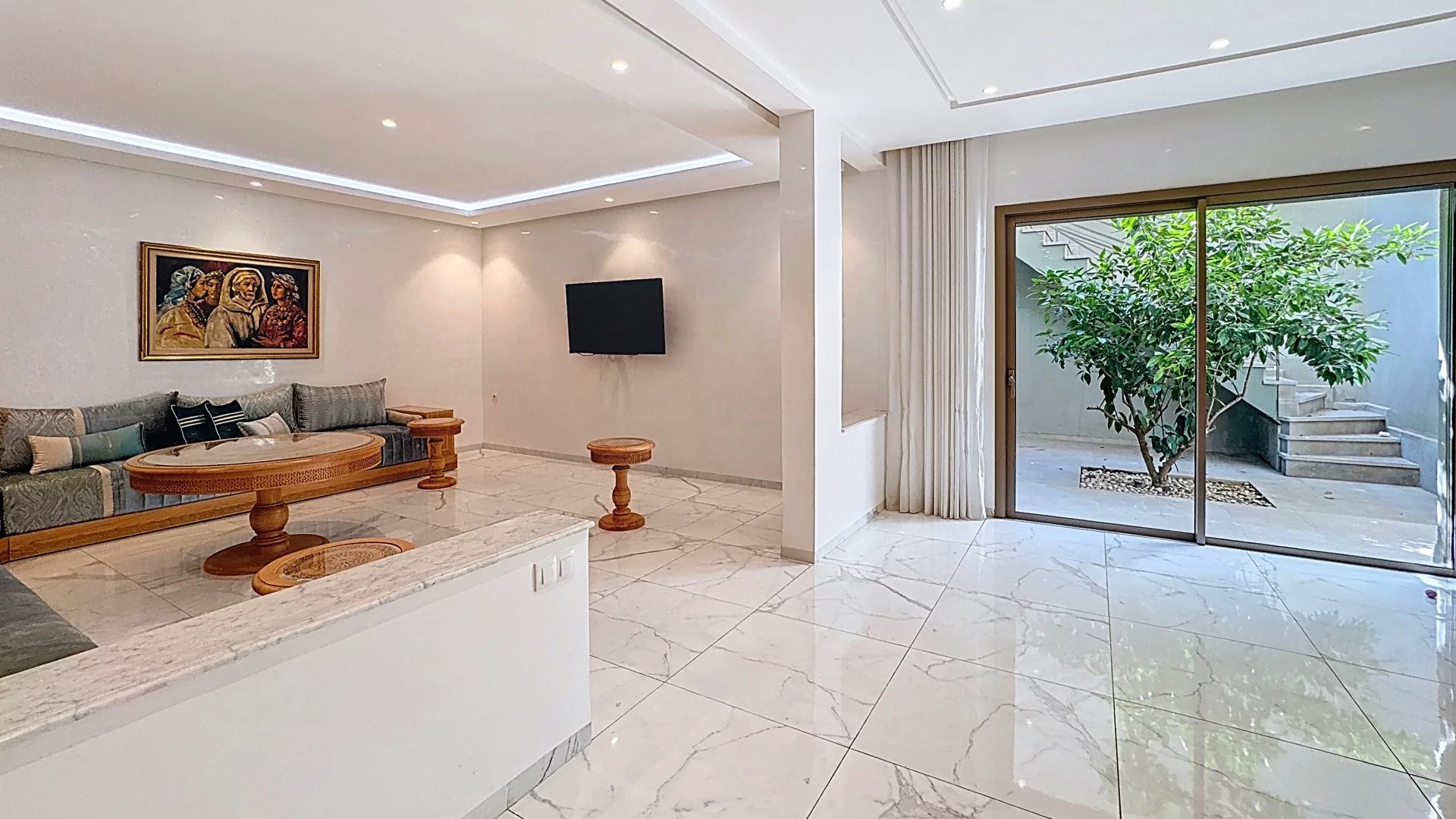 Just a few steps from Marrakech city center in the Agdal tourist area, this semi-detached house with 500m2 of living space is ideal for a rental investment with its 5 bedrooms, or for a family set-up. The villa is built on 3 levels, with a double living and dining area on the ground floor, a guest toilet and a fully-equipped open-plan kitchen. Upstairs are 3 large bedrooms with en-suite bathrooms and dressing rooms, including a master bed room with a very large dressing room and office area. In the basement, to keep cool in the summer months, a second living space with dining room, living room, kitchen, 2 guest bedrooms, a storage area and a hammam. The house has its own swimming pool and covered parking space.