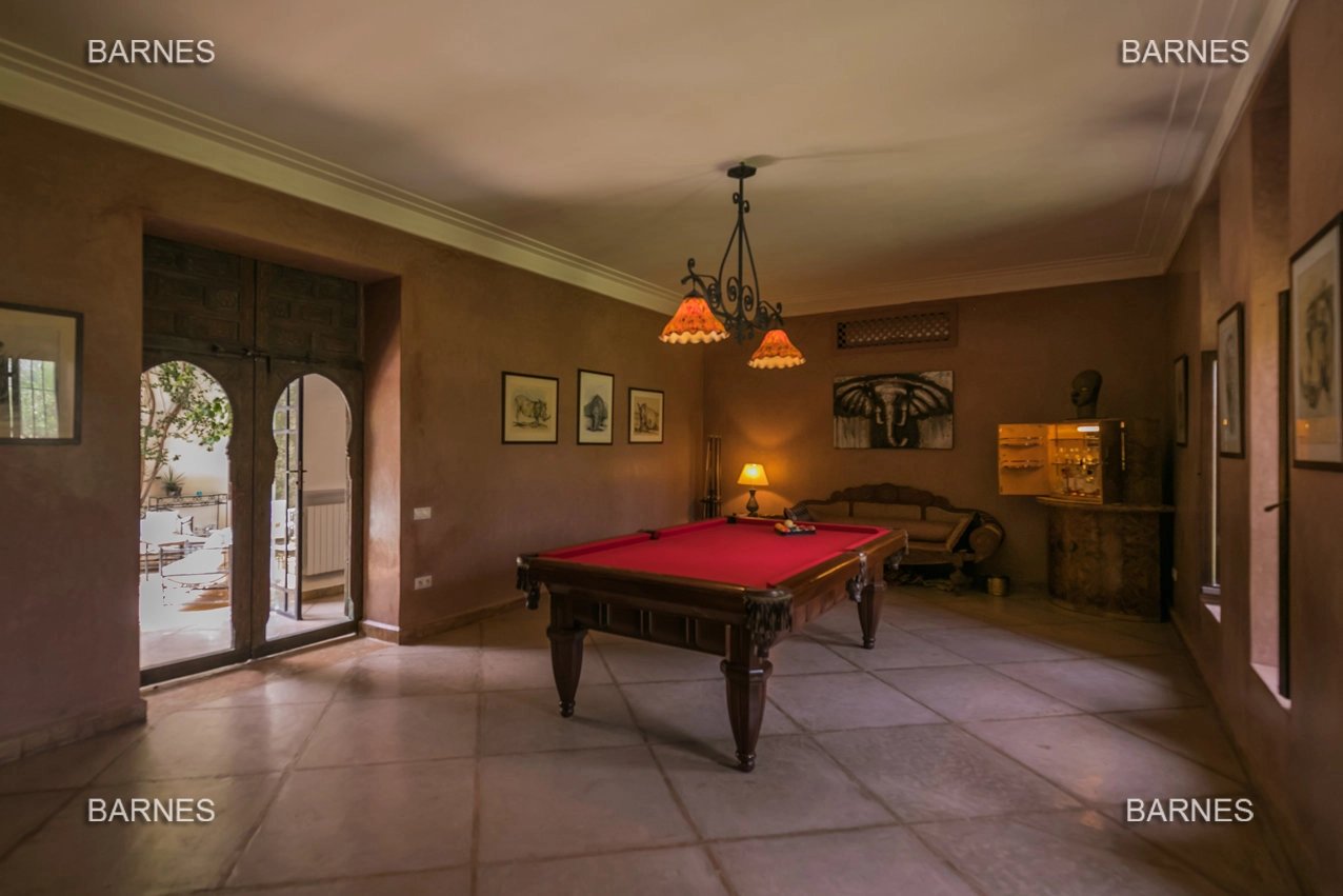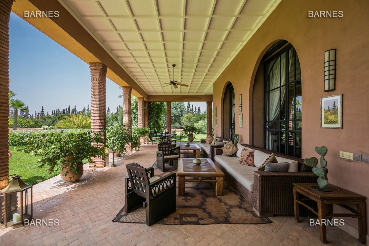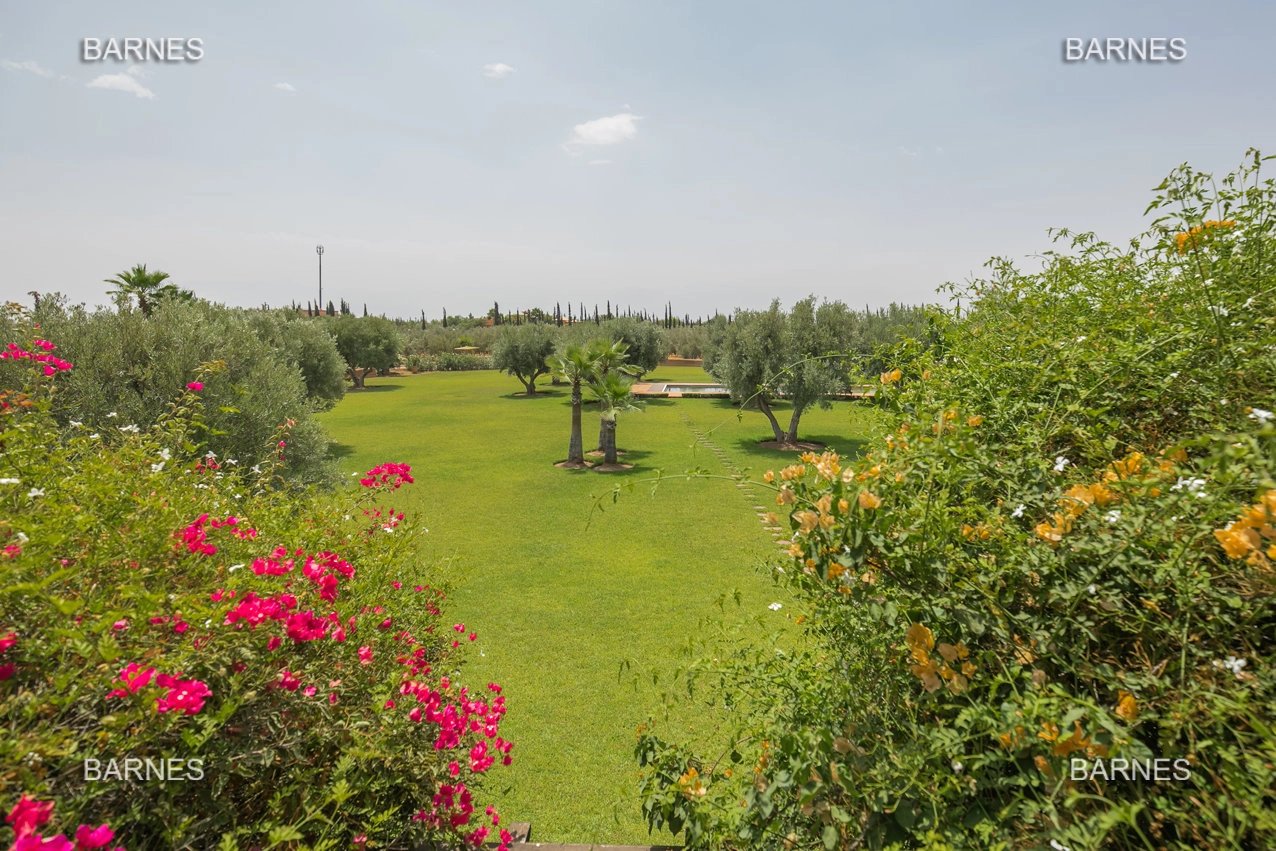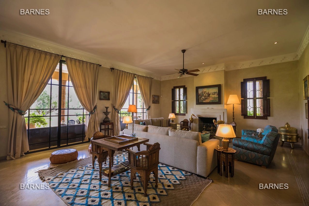 Beautiful villa nestled in the middle of a vast park of over 3 hectares of land, including olive trees, fruit trees, and landscaped gardens, offering breathtaking views of the Atlas Mountains. Located near one of the newest and most sought-after golf courses in Marrakech, this Moroccan-style and art deco property with European comfort is presented as follows: Entrance to a patio hall that leads to a large fireplace living room and a dining room with a fireplace, all overlooking a large furnished terrace area, a large equipped kitchen around a tree-filled patio. There is a TV room with a fireplace as well as a billiards room, 2 bedrooms with bathrooms and dressing rooms, and a large master bedroom with a desk, large dressing room, and bathroom. On the 1st floor are 2 beautiful bedrooms with bathrooms and a lounge, as well as a set of covered or uncovered terraces. The villa has a beautiful pool with a pool house, a large garage, and various accommodations for staff. The materials are of high quality, with central heating, air conditioning, and beautiful finishes.