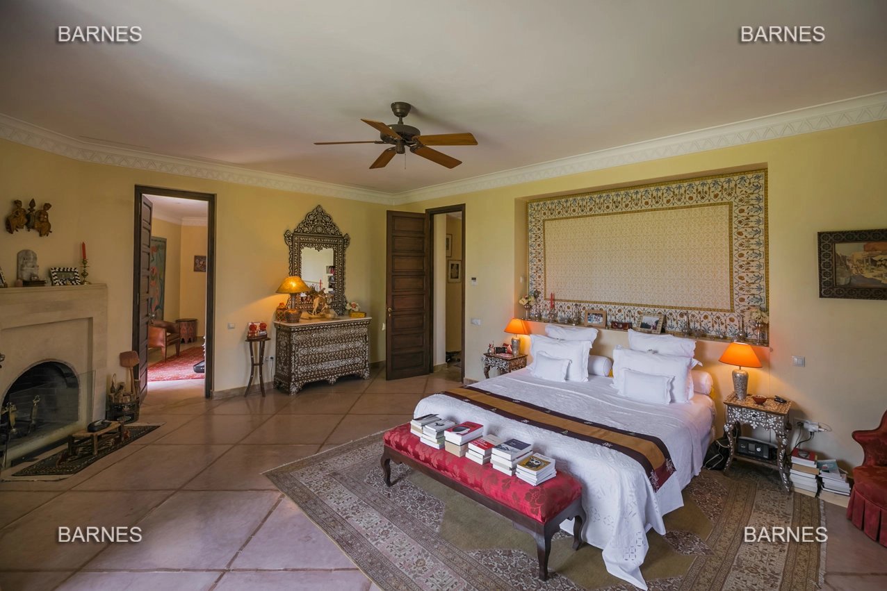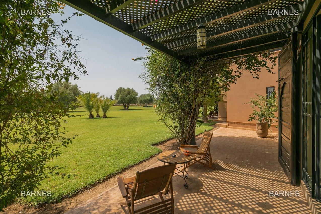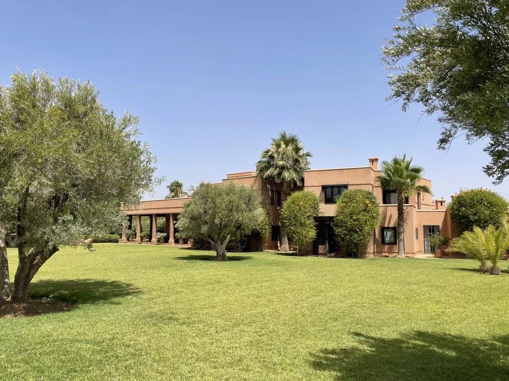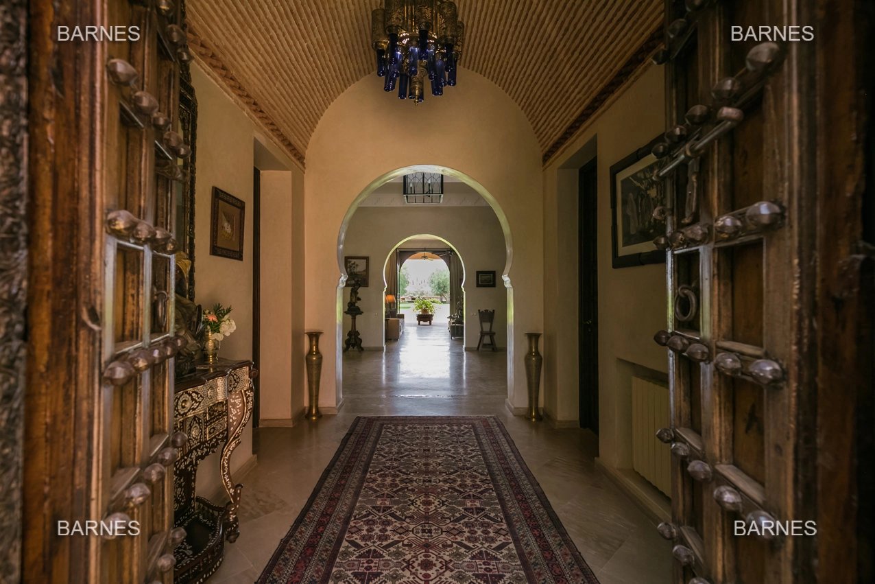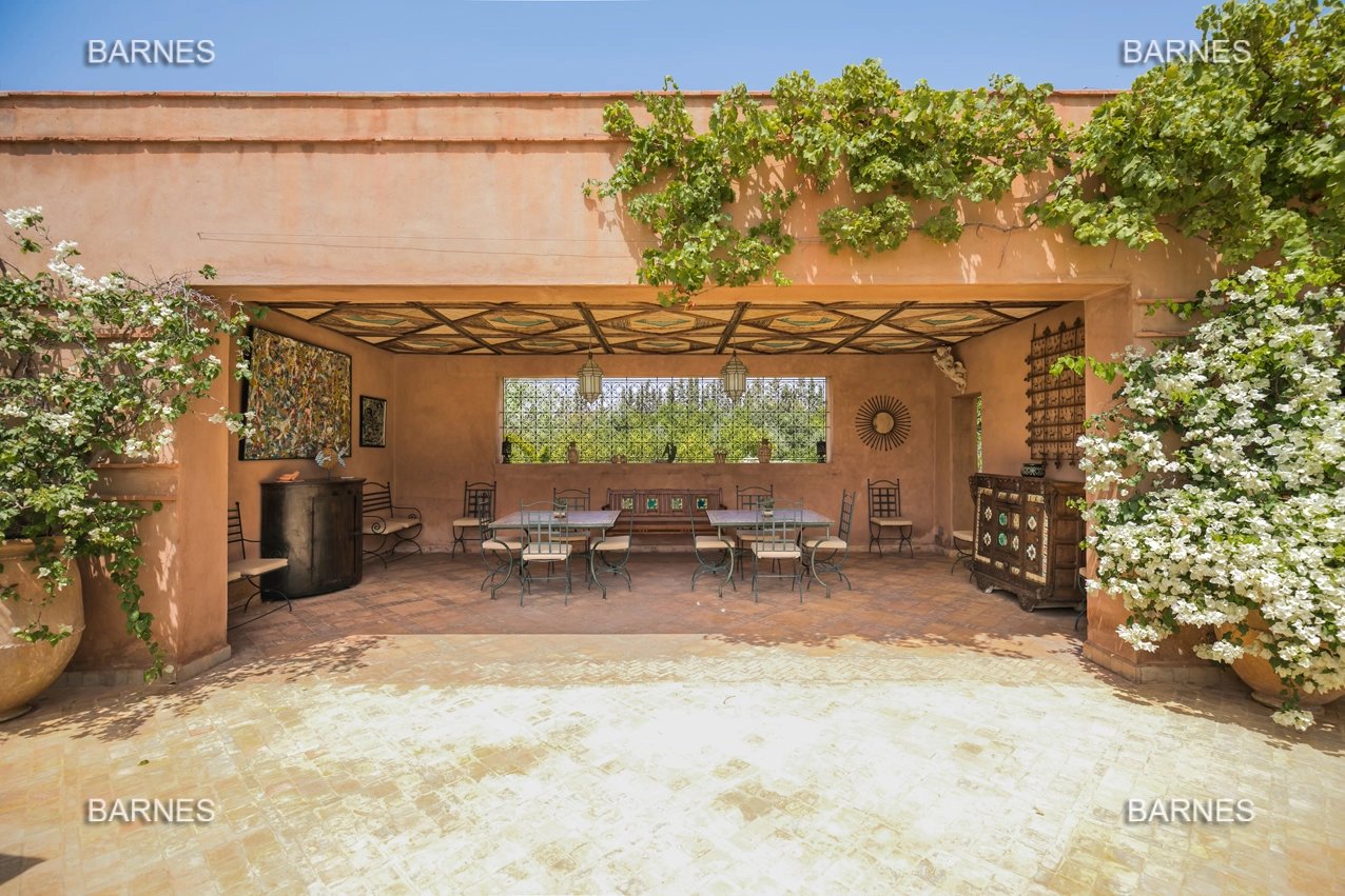 Beautiful villa nestled in the middle of a vast park of over 3 hectares of land, including olive trees, fruit trees, and landscaped gardens, offering breathtaking views of the Atlas Mountains. Located near one of the newest and most sought-after golf courses in Marrakech, this Moroccan-style and art deco property with European comfort is presented as follows: Entrance to a patio hall that leads to a large fireplace living room and a dining room with a fireplace, all overlooking a large furnished terrace area, a large equipped kitchen around a tree-filled patio. There is a TV room with a fireplace as well as a billiards room, 2 bedrooms with bathrooms and dressing rooms, and a large master bedroom with a desk, large dressing room, and bathroom. On the 1st floor are 2 beautiful bedrooms with bathrooms and a lounge, as well as a set of covered or uncovered terraces. The villa has a beautiful pool with a pool house, a large garage, and various accommodations for staff. The materials are of high quality, with central heating, air conditioning, and beautiful finishes.