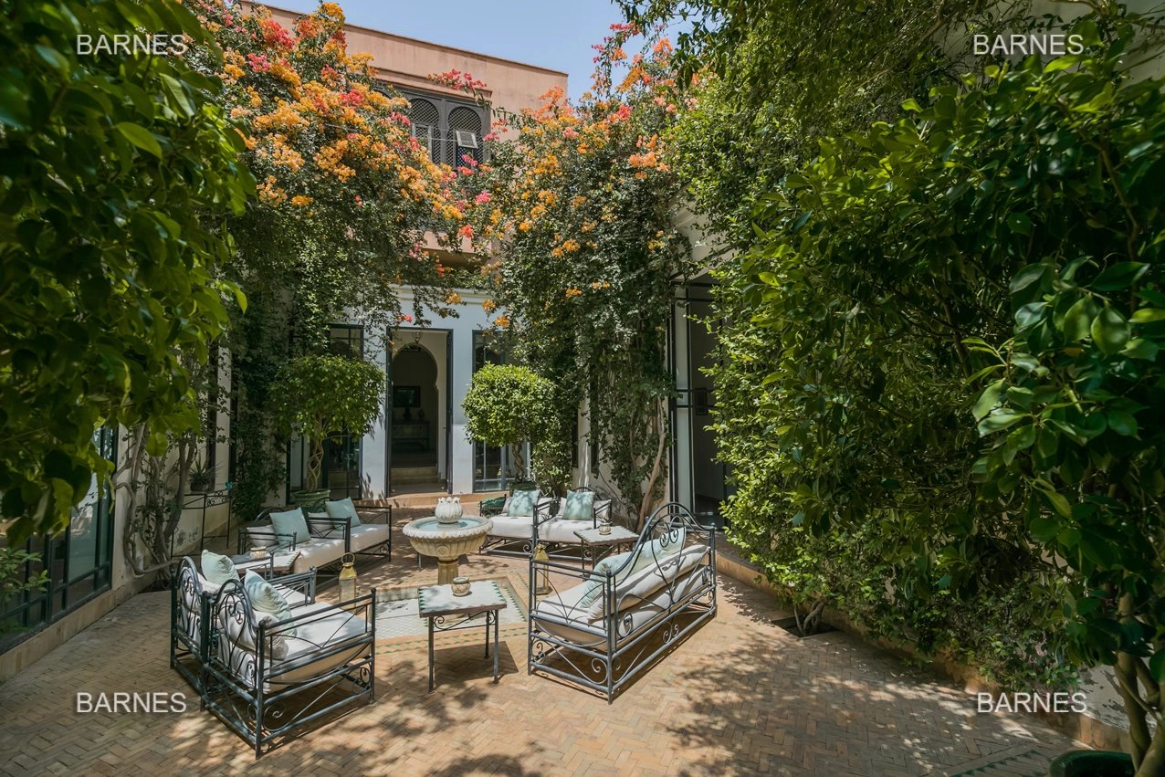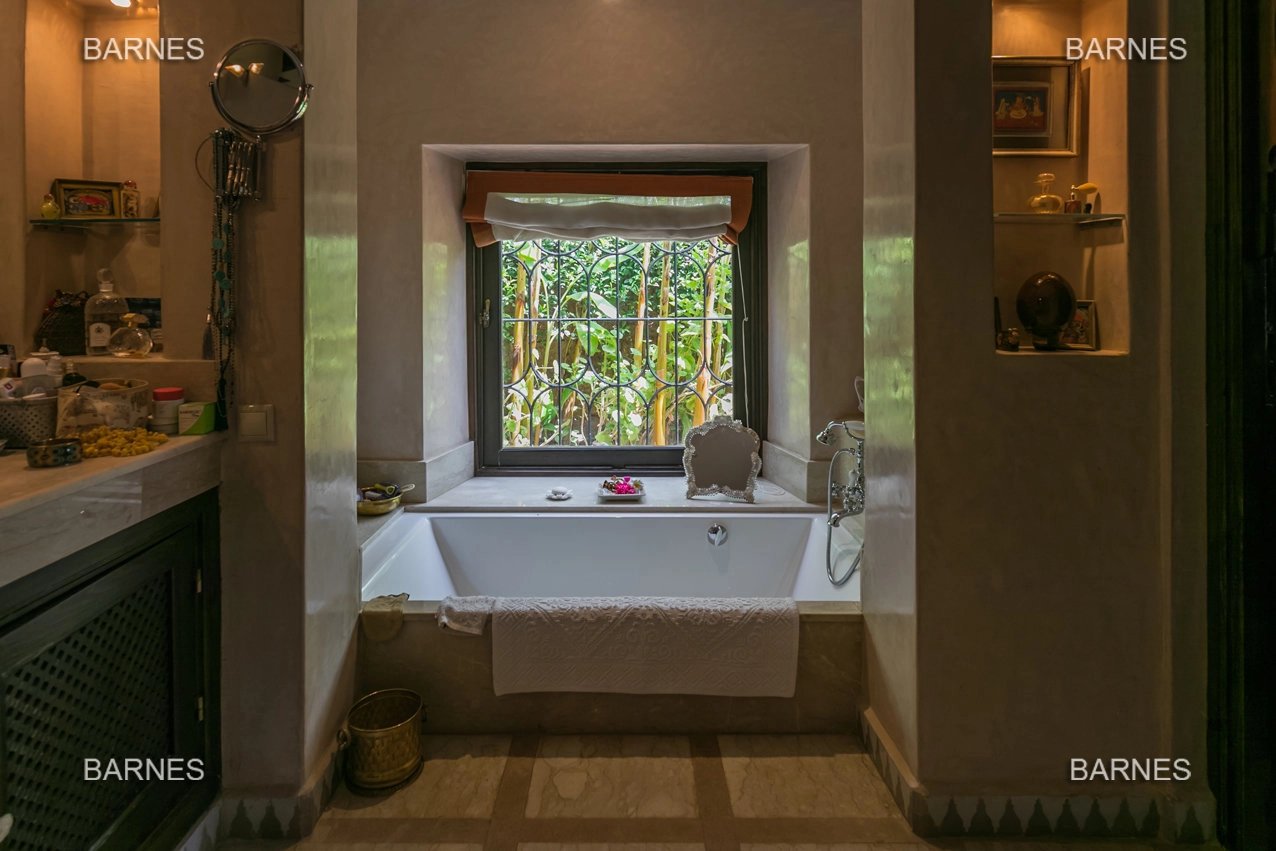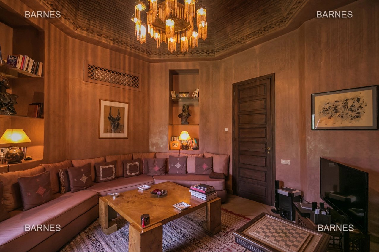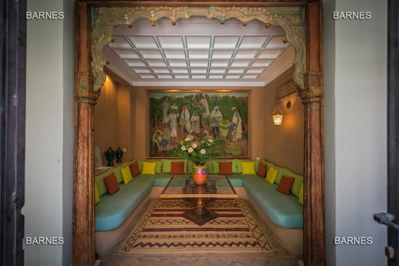 Beautiful villa nestled in the middle of a vast park of over 3 hectares of land, including olive trees, fruit trees, and landscaped gardens, offering breathtaking views of the Atlas Mountains. Located near one of the newest and most sought-after golf courses in Marrakech, this Moroccan-style and art deco property with European comfort is presented as follows: Entrance to a patio hall that leads to a large fireplace living room and a dining room with a fireplace, all overlooking a large furnished terrace area, a large equipped kitchen around a tree-filled patio. There is a TV room with a fireplace as well as a billiards room, 2 bedrooms with bathrooms and dressing rooms, and a large master bedroom with a desk, large dressing room, and bathroom. On the 1st floor are 2 beautiful bedrooms with bathrooms and a lounge, as well as a set of covered or uncovered terraces. The villa has a beautiful pool with a pool house, a large garage, and various accommodations for staff. The materials are of high quality, with central heating, air conditioning, and beautiful finishes.