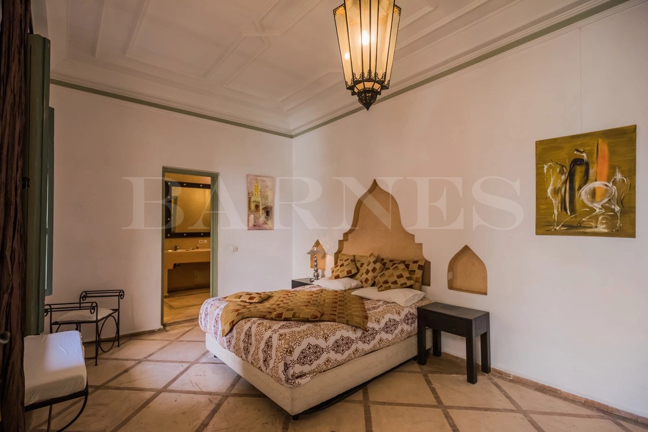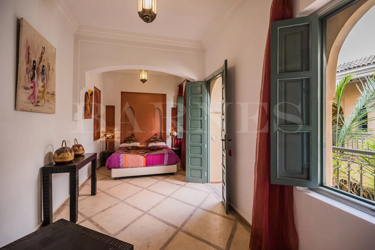 Located 5 minutes from Dar Bacha, with a total area of 181m2 and a small douiria of 31m2, this riad maison d'hôtes is for sale. On the ground floor, there is an entrance hall, a patio, a bhol, a luggage room, a WC, a bedroom with en-suite bathroom, a living room with fireplace, a dining room, a kitchen, a pantry with a dumbwaiter, and a cellar. On the first floor, there are four bedrooms with en-suite bathrooms and a patio. The douiria features a WC, a hall, and a door to the outside. The terrace includes a laundry room, a bedroom with en-suite bathroom, a terrace, and a basin