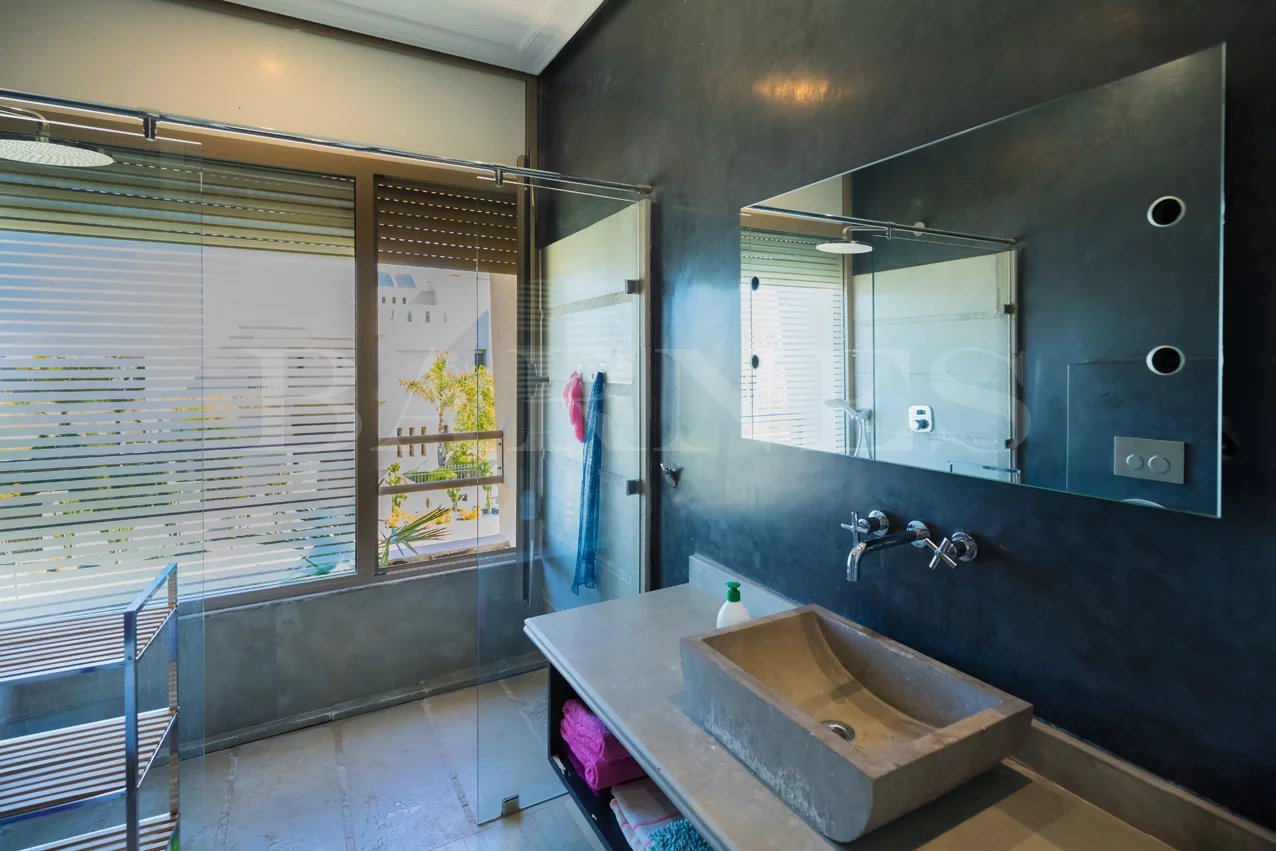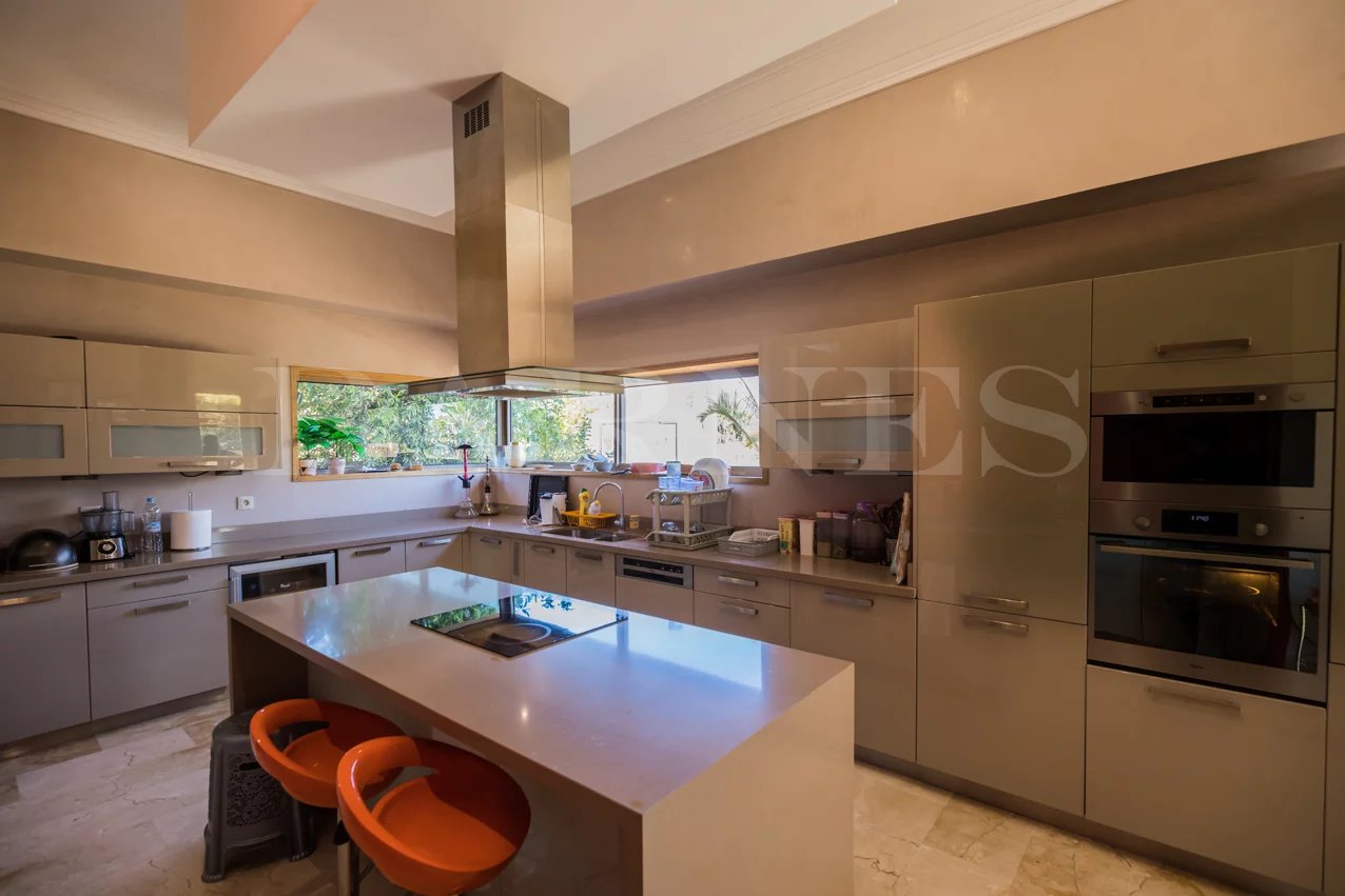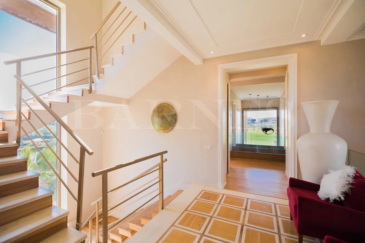 Located on a golf course at the outskirts of the city center, this beautiful modern villa with spacious private garden and swimming pool comprises: an entrance onto a patio, large reception area with fireplace, dining room, large equipped kitchen open onto the living room, guest toilet, garage. On the first floor: 1 master bedroom with bathroom and large dressing room, a large panoramic terrace, 2 bedrooms with en-suite bathrooms. Reversible air conditioning, quality materials.