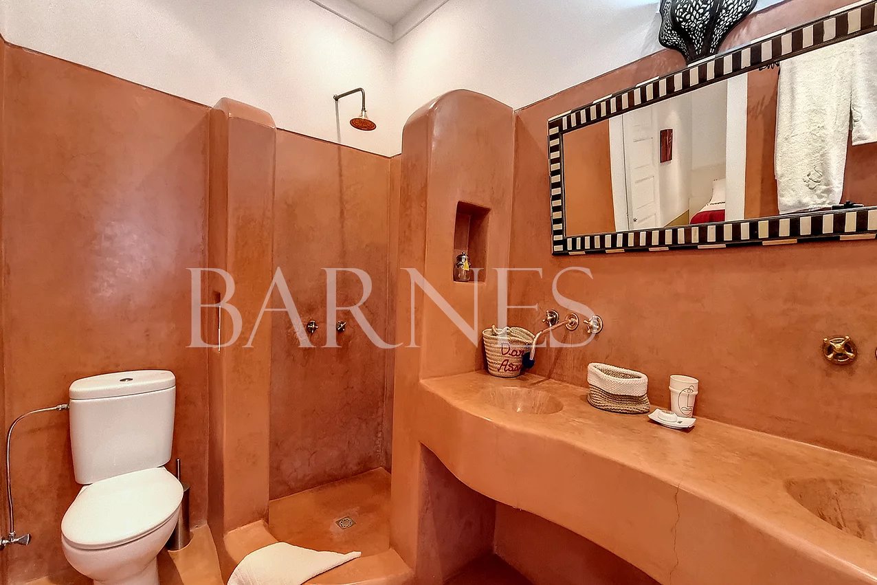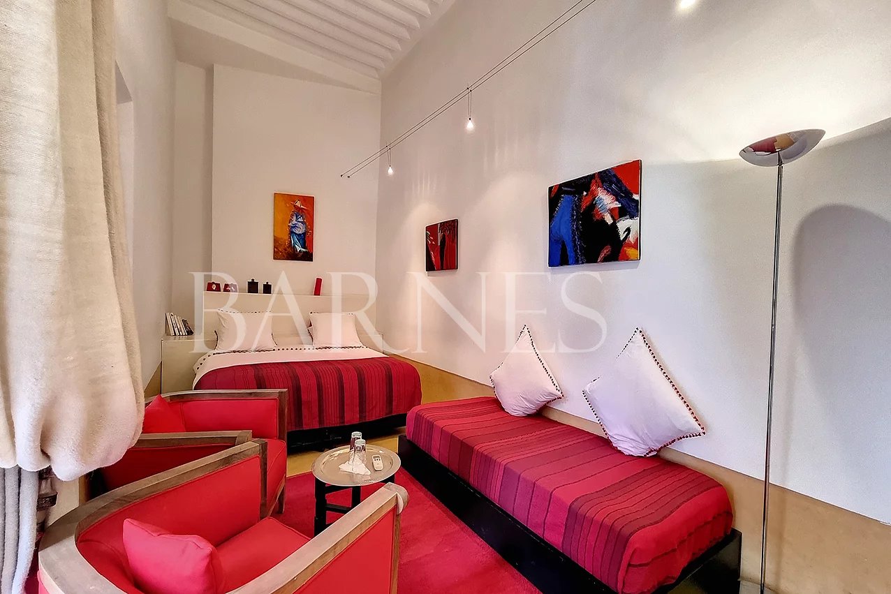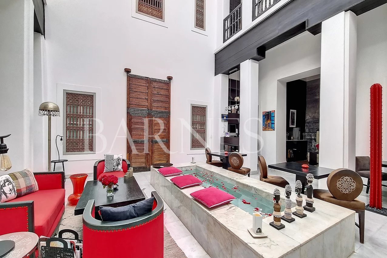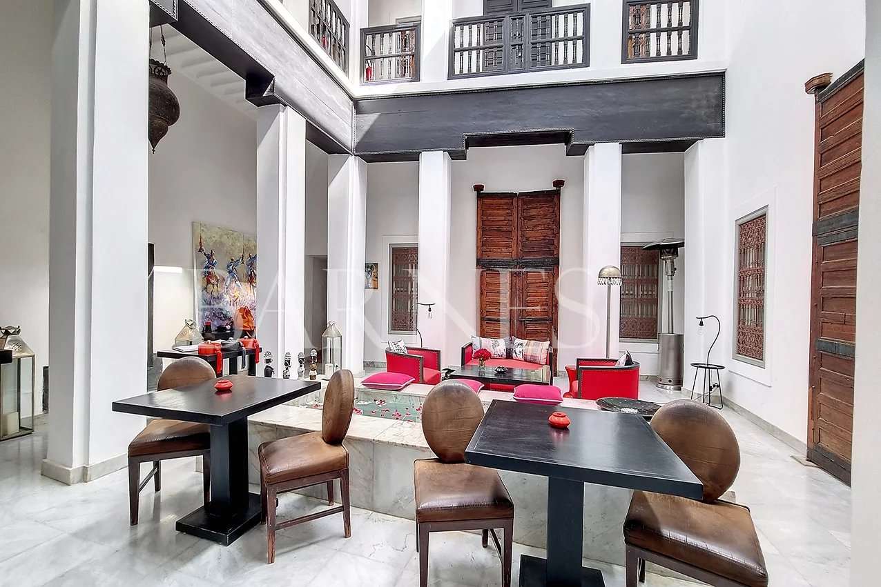Ideally located in the historic heart of the city, nestled around the Spice Square, close to the famous Jemaa El Fna Square, in the Rahba Lakdima neighborhood, we offer this dream riad for sale with an area of 186m2. It stands out for its atypical architecture, its volumes, and its beautiful and very bright patio. On the ground floor: A patio with a basin Two bedrooms with private bathrooms A bhou (living room open to the patio) An equipped kitchen A guest toilet On the first floor: 3 tastefully decorated suites, each with their own bathroom The roof terrace has various relaxation areas: a solarium, a pergola-covered living area, and a dining area. A panoramic view of the Medina and the Atlas Mountains. This riad holds operating and classification licenses as a "guesthouse". Titled property. Reversible heating/air conditioning in all rooms.