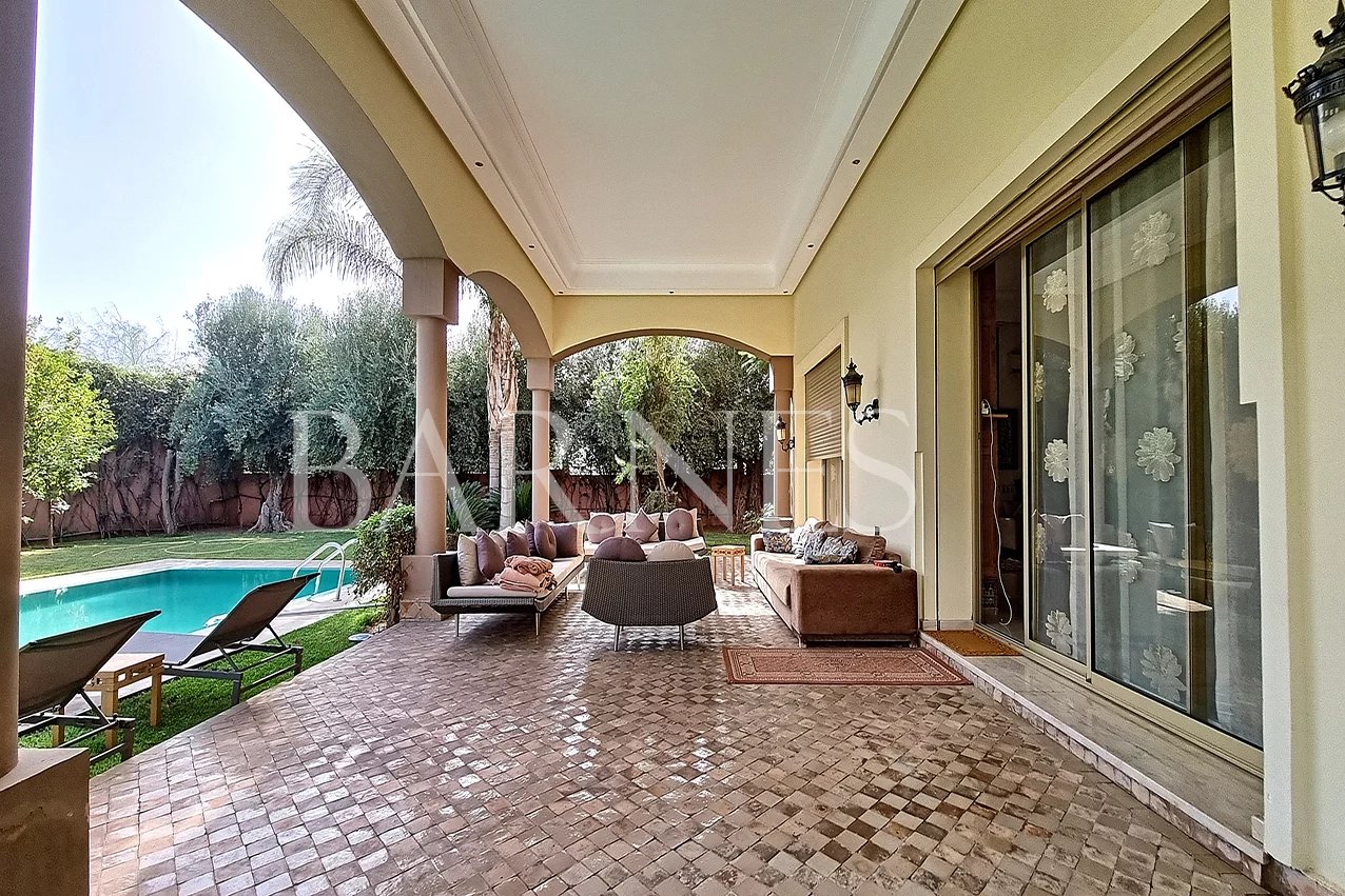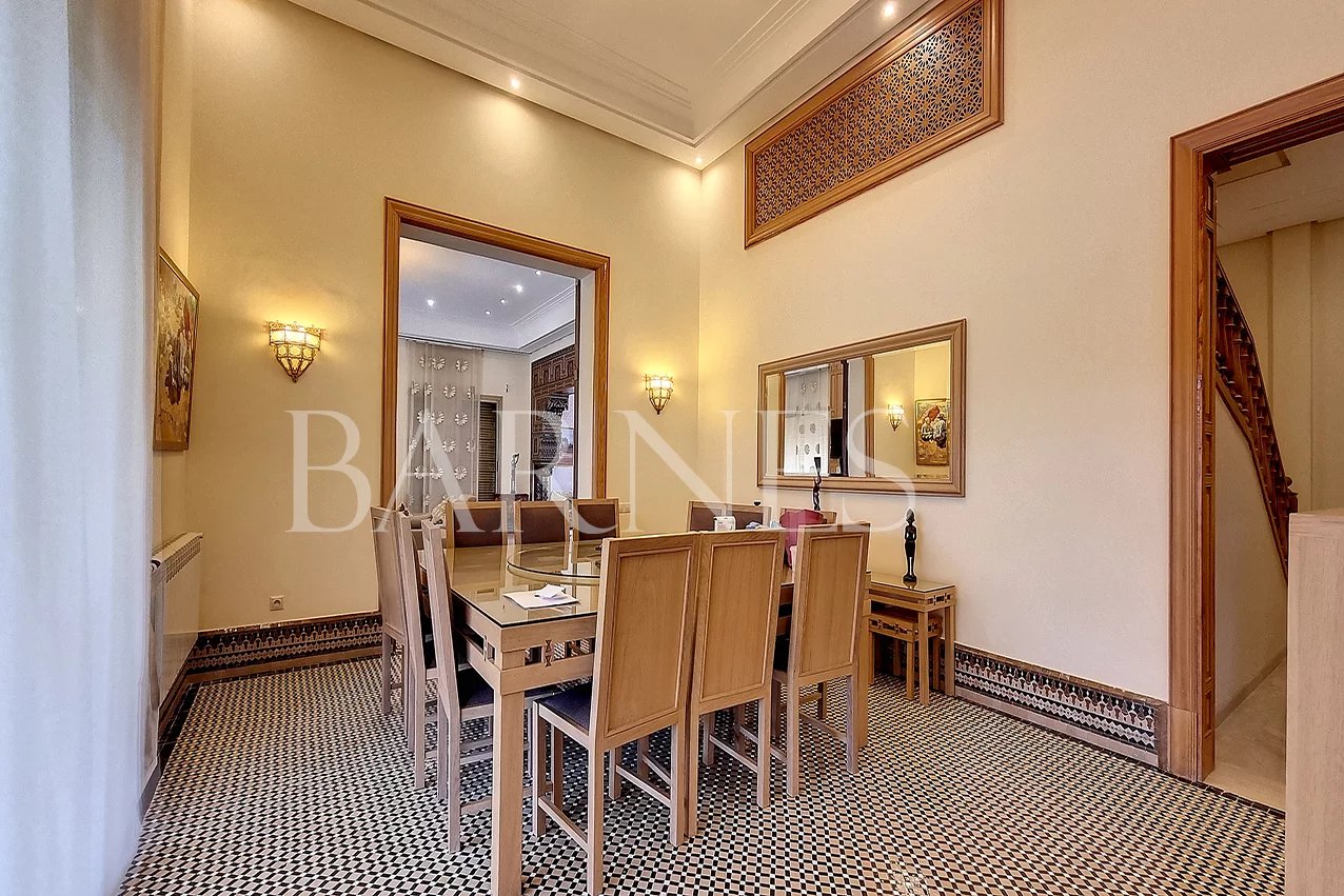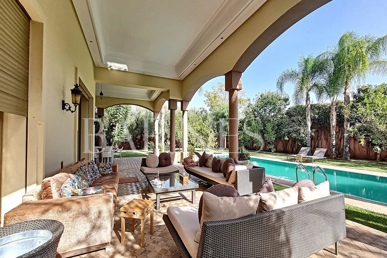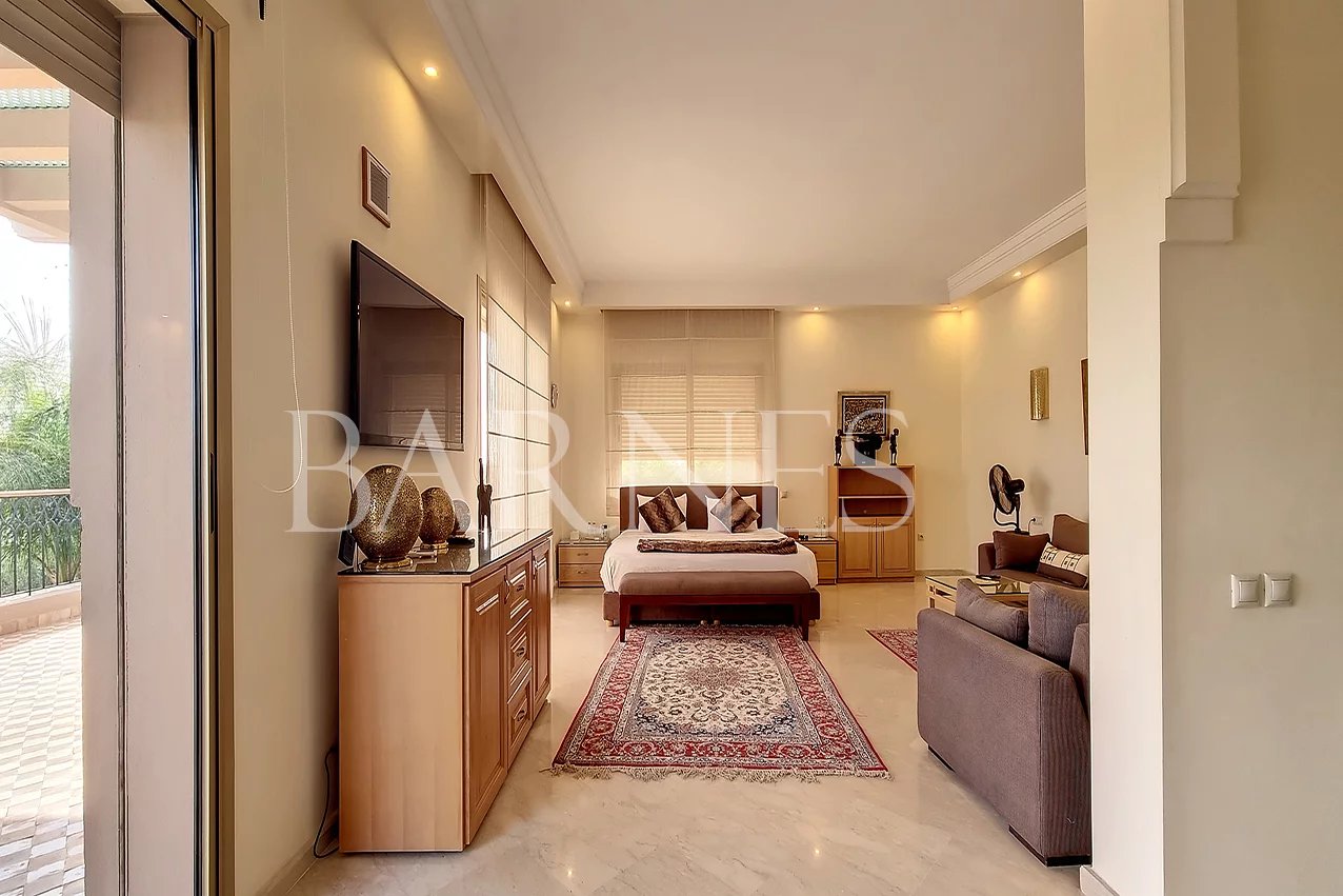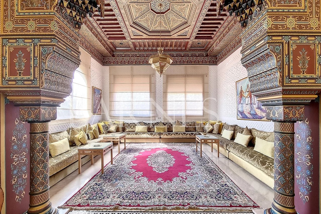 Magnificent property for sale on 1700 sqm of land and 700 sqm of living space, near the Atlas Golf (9 holes), on one level. On the ground floor, there is a very large living room with a fireplace overlooking the swimming pool, a large veranda, a dining room, an equipped kitchen, a large garden, parking for at least 5 cars, a guard lodge, a maid's lodge, and an elevator to access the 5 suites with communicating balcony, strategically located for rental purposes.