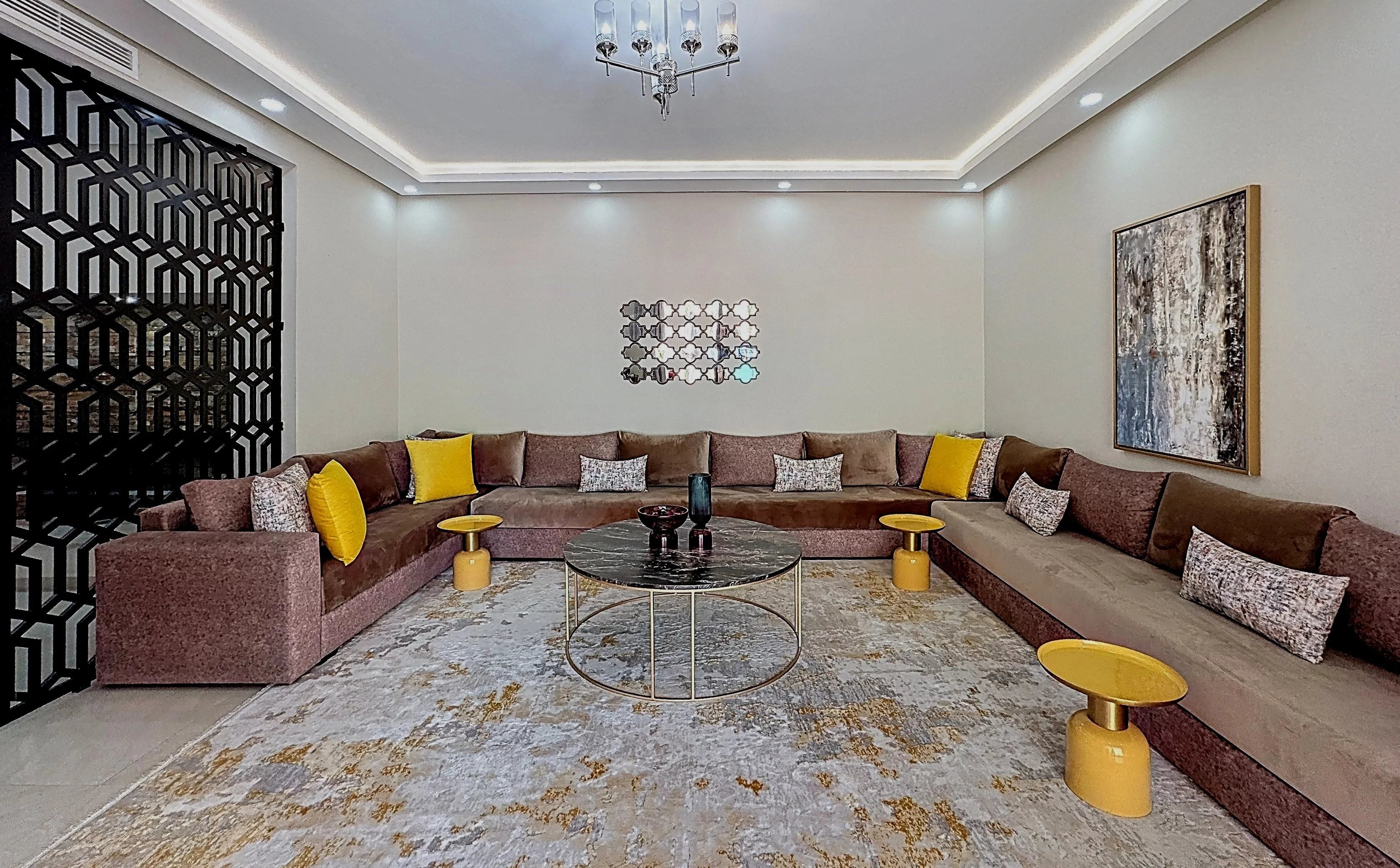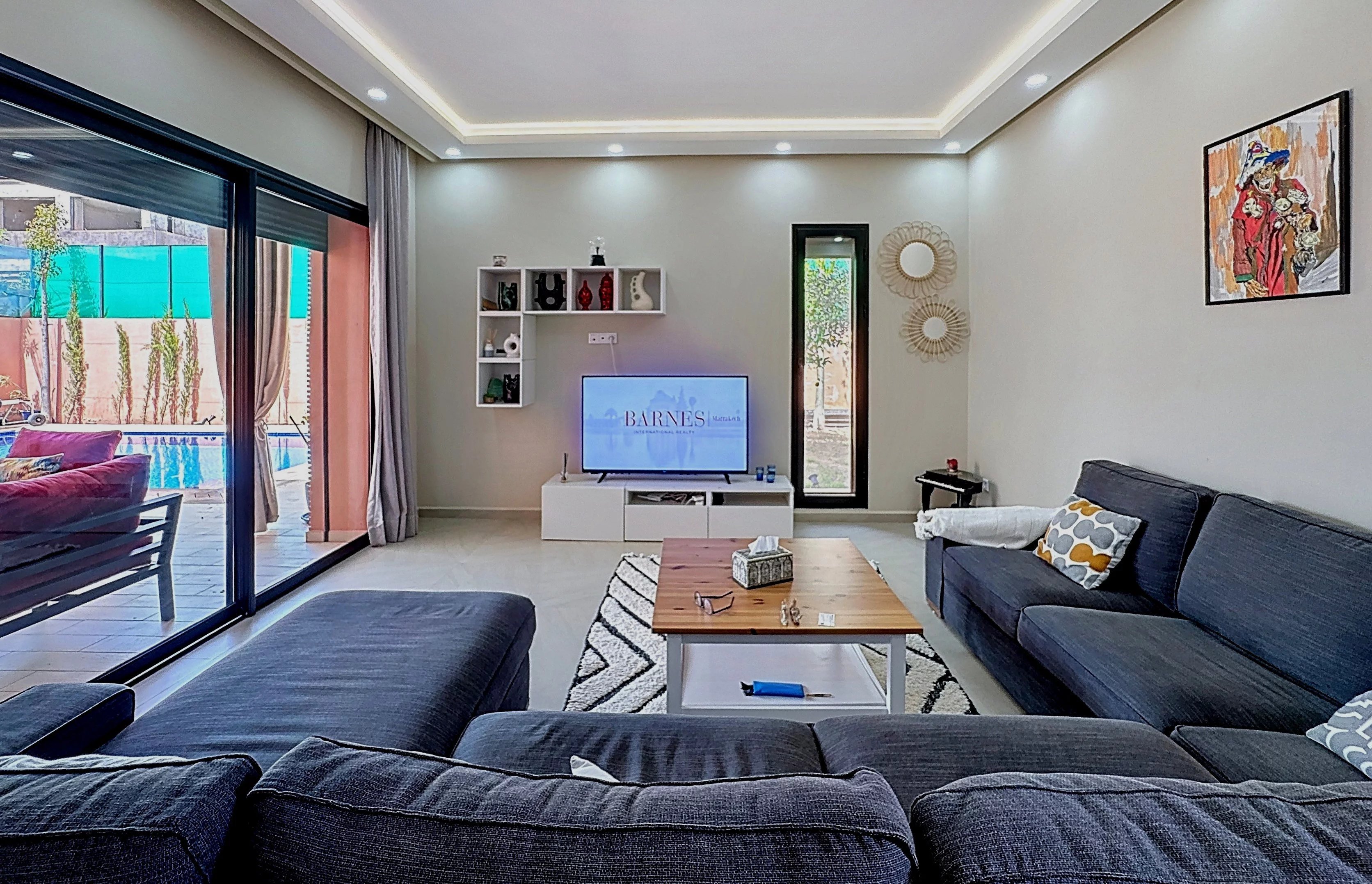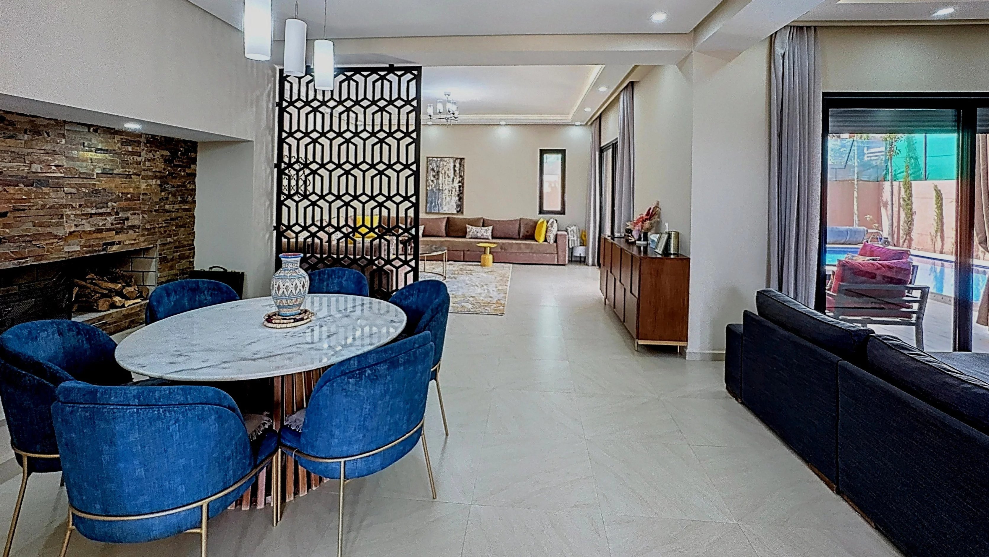Idéalement située sur le prestigieux golf d’Akenza, à seulement 10 km du centre-ville de Marrakech, cette villa représente une opportunité rare, aussi bien pour un investissement locatif que pour une élégante résidence secondaire. Édifiée sur un terrain de 400 m², la propriété développe environ 300 m² habitables répartis sur deux niveaux, offrant des volumes généreux et une distribution harmonieuse. Le rez-de-chaussée accueille plusieurs espaces de vie conviviaux, comprenant un salon TV, un authentique salon marocain, ainsi qu’une cuisine fonctionnelle. L’ensemble s’ouvre sur une vaste terrasse ombragée, idéale pour profiter pleinement du climat en toute saison. À l’étage, l’espace nuit propose trois chambres, dont une belle suite parentale avec grand dressing et terrasse couverte privative, offrant confort et intimité. Une villa au fort potentiel, alliant emplacement recherché, charme et qualité de vie.