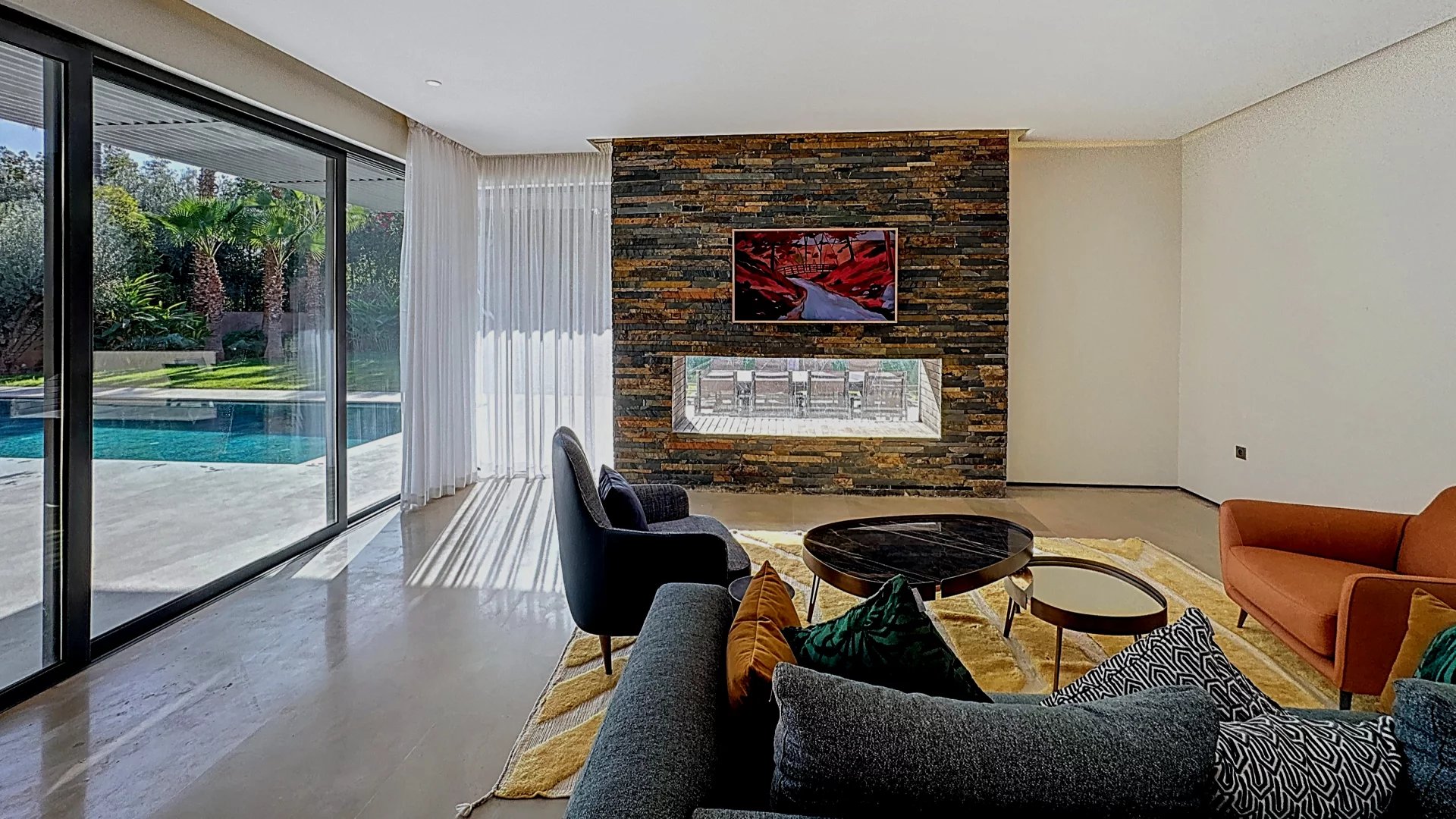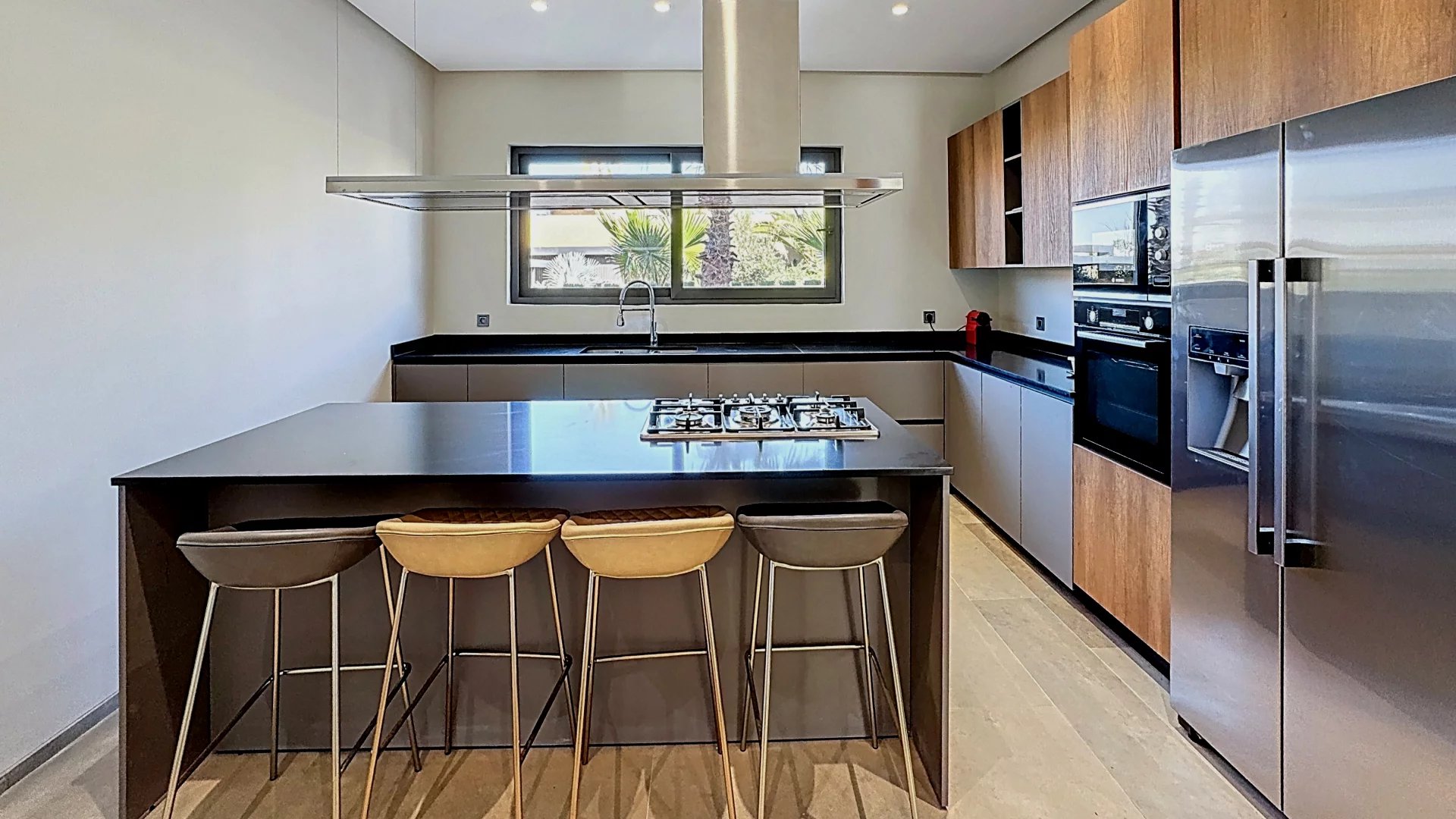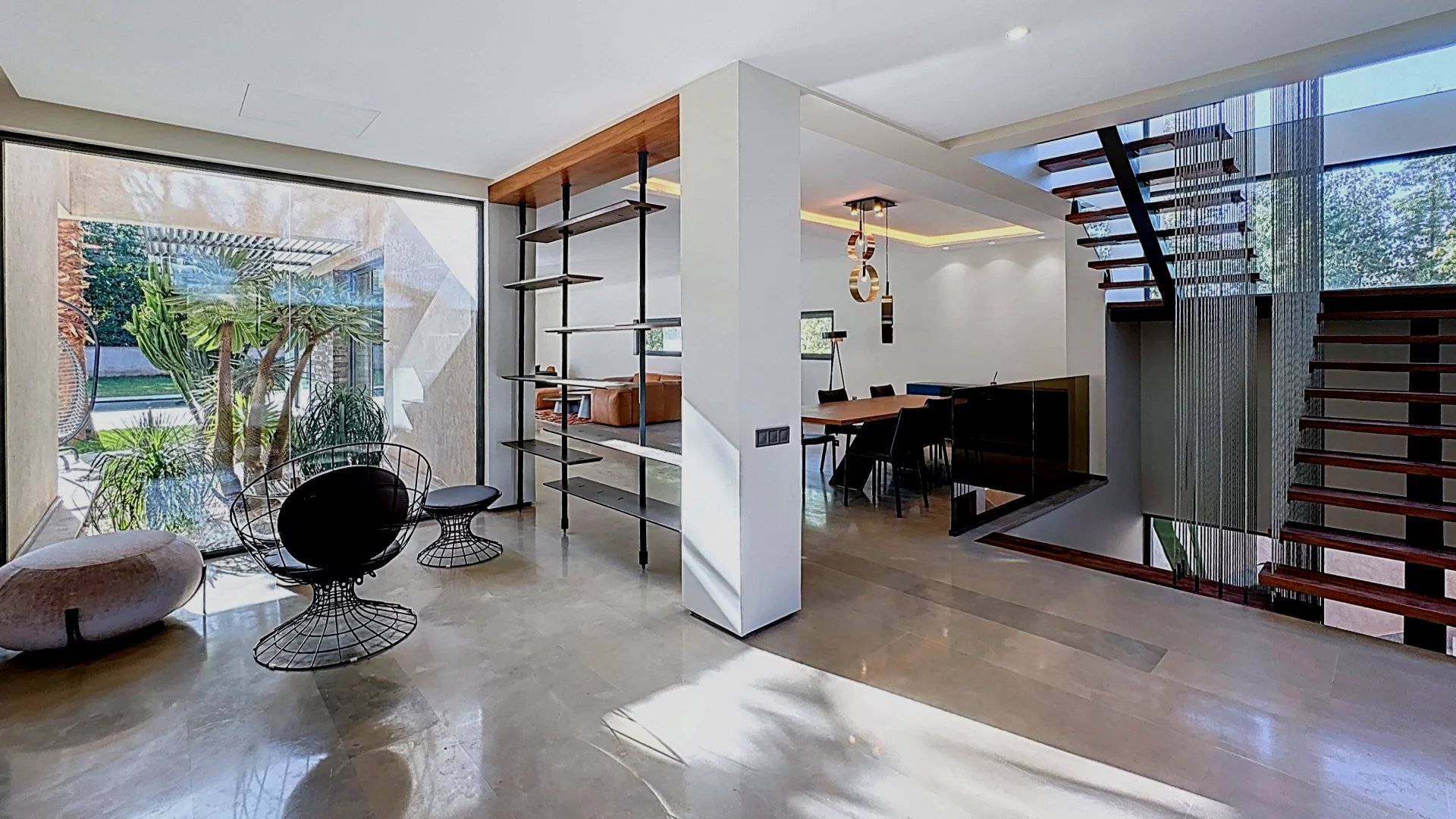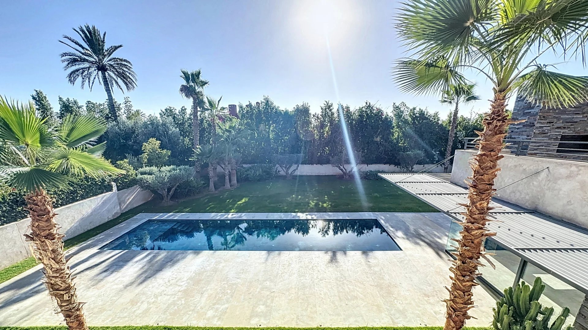 Découvrez cette superbe villa neuve au style résolument moderne, idéalement située au cœur du prestigieux Golf d’Amelkis, dans un environnement sécurisé, calme et recherché. D’une superficie de 675 m² habitables, édifiée sur un terrain paysagé de 1 505 m², la propriété offre des volumes généreux, une luminosité exceptionnelle et des prestations haut de gamme. ⸻ Disposition intérieure Rez-de-chaussée • Vaste double séjour traversant, baigné de lumière grâce à ses larges baies vitrées donnant sur le jardin et la piscine. • 1 chambre de plain-pied avec terrasse privée, dressing et salle de bain complète. Entre-sol • 1 suite indépendante avec terrasse privative et jacuzzi, idéale pour les invités. • 2 chambres pour le personnel. • Un hammam traditionnel. • Une salle de sport entièrement aménageable selon les besoins. Premier étage • 3 suites dont : • Une master suite d’exception, bénéficiant d’une vaste terrasse surplombant le jardin et la piscine, avec dressing et salle de bain luxueuse. Extérieurs & Prestations • Grande piscine entourée d’un jardin soigneusement paysagé. • Architecture moderne associant lignes épurées et matériaux nobles. • Emplacement premium au sein du golf, offrant tranquillité, vue dégagée et proximité des clubs house et services.